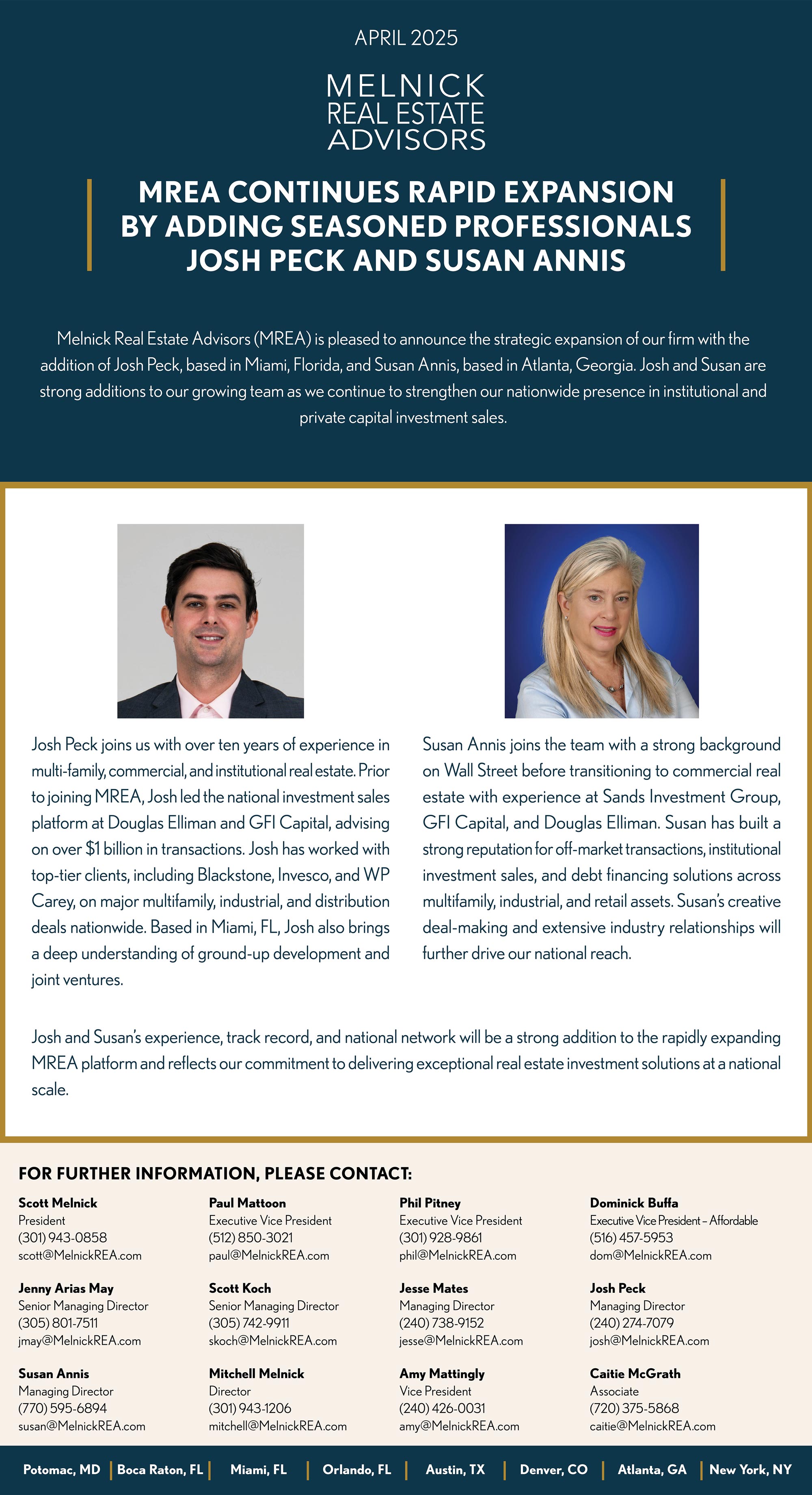 Melnick Real Estate Advisors (MREA) is pleased to announce the strategic expansion of our firm with the addition of Josh Peck, based in Miami, Florida, and Susan Annis, based in Atlanta, Georgia. Josh and Susan are strong additions to our growing team as we continue to strengthen our nationwide presence in institutional and private capital investment sales.